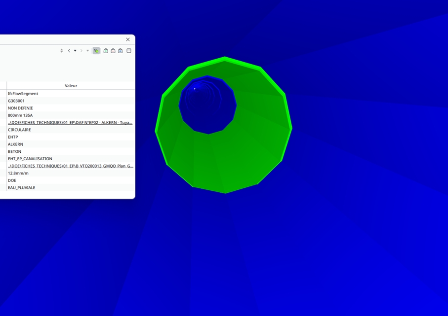 Vue depuis l’intérieur d’une canalisation d’eau posée par EHTP, avec l’étiquette des informations associées à l’objet 3D.